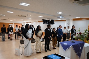 式次第に沿って、メイン会場の高梁キャンパスに合わせて、起立・礼・着席、国歌斉唱や学園歌・逍遥歌・学歌斉唱をしました。