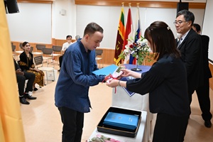 昼食のあと、大講義室に戻り、スリランカティーの体験をしました。スリランカからの留学生が紅茶を入れ、参加者全員にお菓子と一緒に配りました。その後、現地での普段の紅茶の飲む時間帯など日本語で全体説明しました。