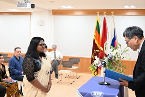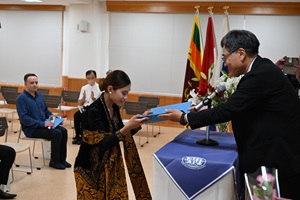 学食体験のあと、大講義室にてスリランカ出身の学生によるティーサービスと本国での喫茶習慣についての説明がありました。