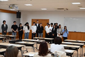 7月9日2時限、大講義室にて、本年度3回目となるスタディ・アブロード報告会と春学期に交換留学で外国学科で学んでいる留学生たちのスピーチを行いました。