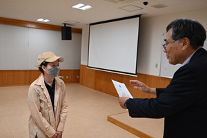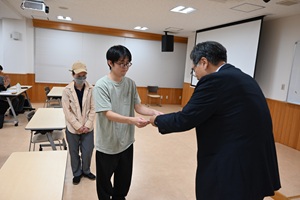 4年次生のオリエンテーションでは、本学の「数理・データサイエンス・AI教育プログラム(リテラシーレベル)」の修了証が畝先生から手交されました。