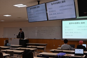 2025年度の夏休み、12月までにスタディアブロード(留学)を終えた学生4名からの報告とこれから帰国する交換留学生たちの日本滞在中の内容での発表会で構成されています。